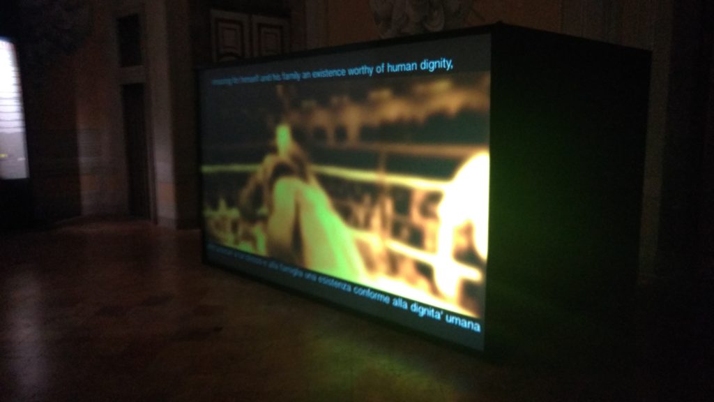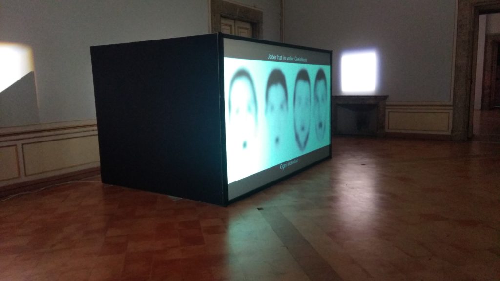 Nelle foto i Cubo Gallery di RC Sistemi Audiovisivi adottati dall’artista Umberto Ciceri per la sua mostra “HUMAN fights rights lights” titolo della video trilogia che teatralizza il testo integrale della Dichiarazione Universale dei Diritti Umani del 1948, in occasione del suo settantesimo anniversario, attraverso l’ambiguità etica ed estetica del linguaggio mediatico adottato.