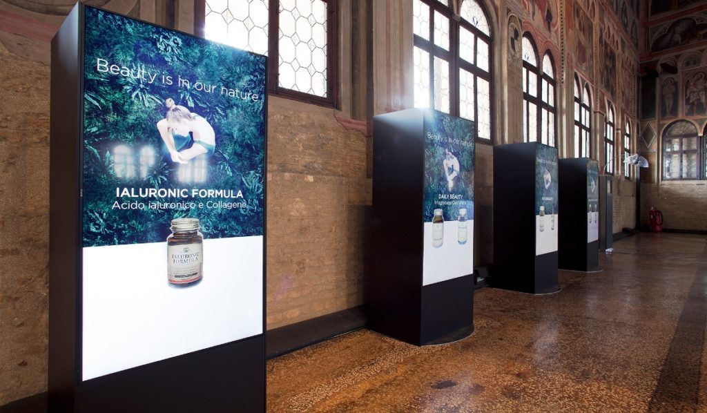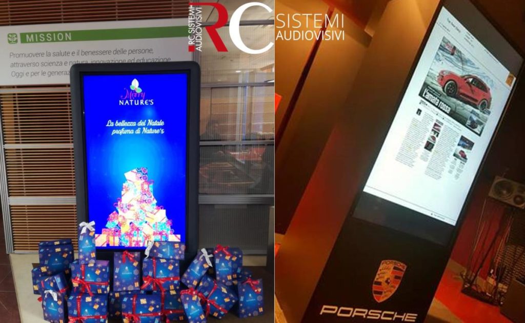 I totem per il digital signage di RC Sistemi Audiovisivi sono personalizzabili con il brand del cliente e disponibili sia in vendita che a noleggio per eventi e convegni, per le sale di attesa di centri medici e banche, per promozioni speciali periodiche nei negozi e showroom aziendali, mostre periodiche nei musei, reception di hotel e centri congressuali.